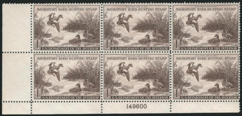 $1.00 1942 Hunting Permit (RW9). Bottom left plate no. 149600 block of six, pos. 2 with small gum disturbance, possibly natural, Very Fine, Scott Retail as Mint N.H.