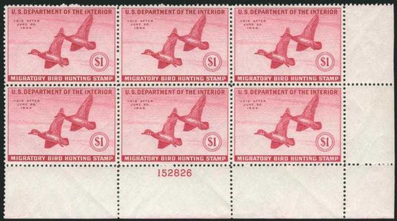 $1.00 1944 Hunting Permit (RW11). Mint N.H. wide top right plate no. 155590 block of six, very attractive centering with lovely vivid color, Very Fine-Extremely Fine