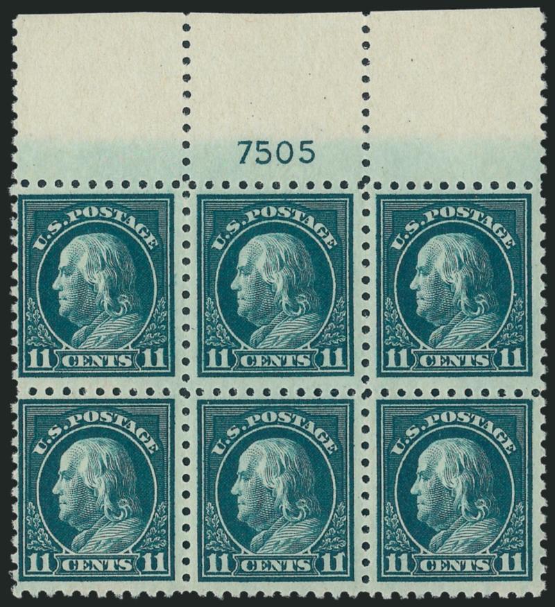 2634 nhbl Image1916-17 Washington-Franklin Issues Plate Blocks (461/473). Mint N.H. plate no. blocks of six of Nos. 462-463 and 473 (No. 463 from plate no. 7942, which produced the error No. 467), plate no. block of six of No. 470, lightly hinged in selvage, also booklet panes Nos. 462a and 463a, latter Mint N.H., Fine-Very Fine (Image)