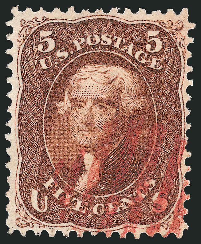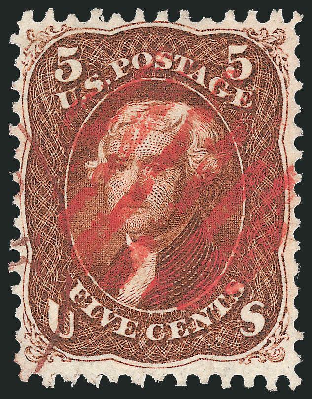 5c Red Brown (75). Intense shade and impression, vivid red grid cancel, Very Fine and choice, exceptionally colorful example of the 5c Red Brown, with 1991 and 2005 P.F. certificates (Image)Search for comparables at SiegelAuctions.com |
