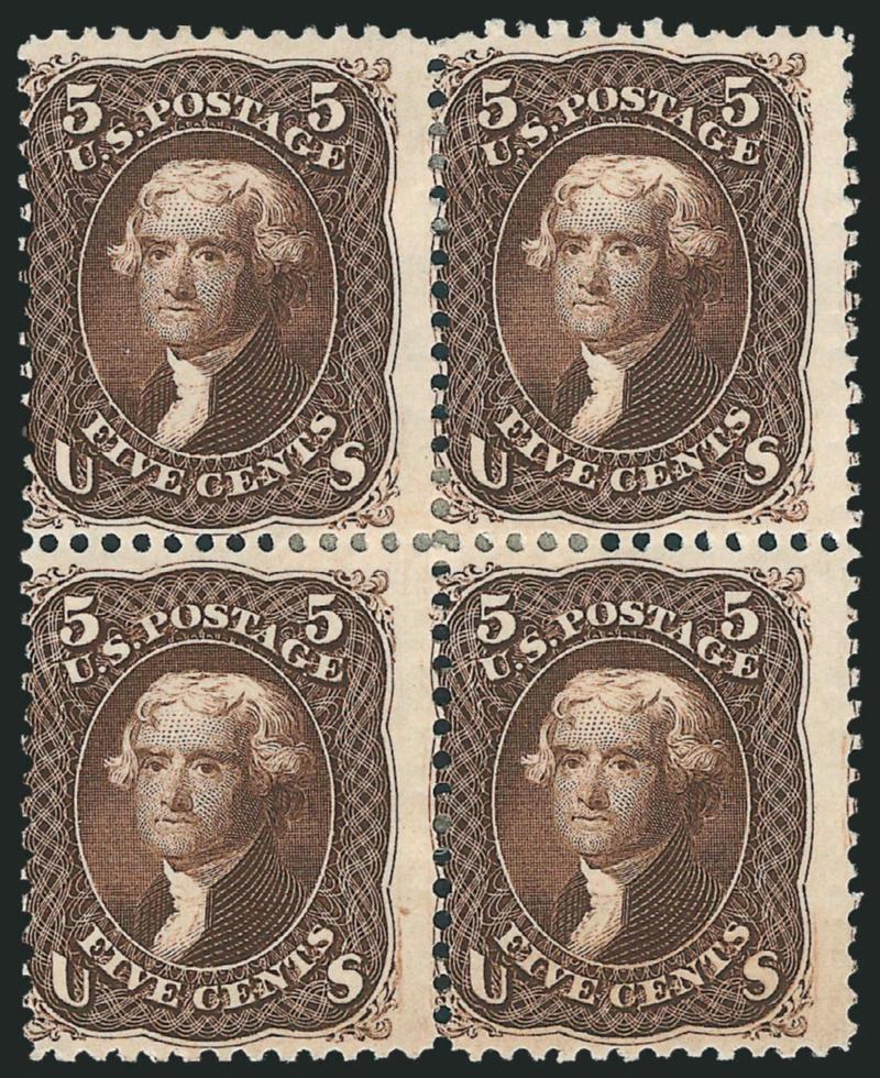 5c Dark Brown (76). Block of four, original gum, magnificent deep rich color and clear impression, perfs slightly in at left, attractive example of this rare unused block of which there are very