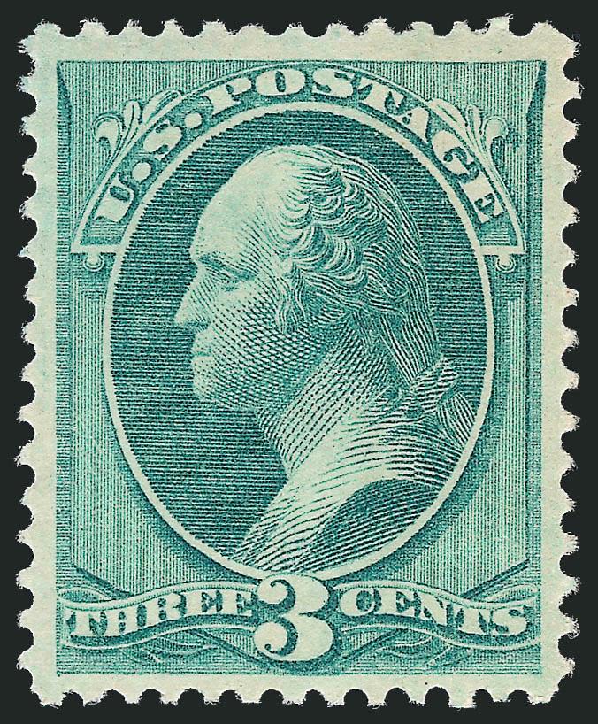 1389 nh Image3c Green (147). Mint N.H., bright shade, choice centering with wide and balanced margins, small natural inclusion on gum side is barely evident in Washington's hair, Extremely Fine, the 3c 1870 National is very difficult to find in choice Mint N.H. condition, as opposed to its 1873 Continental counterpart, Scott Retail as hinged (Image)