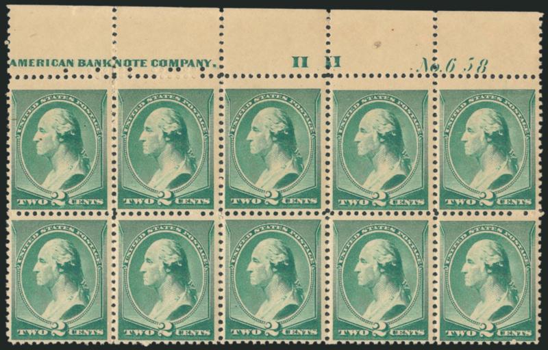 1437 nhbl Image2c Green (213). Mint N.H. top imprint, plate no. 658 and "I I" block of ten, perfs clear throughout with wide top margins, some small natural gum skips and single gum bend bottom left stamp, light toning mostly confined to selvage, Very Fine, an extremely scarce top plate block, a review with Power Search found only one other (Image)