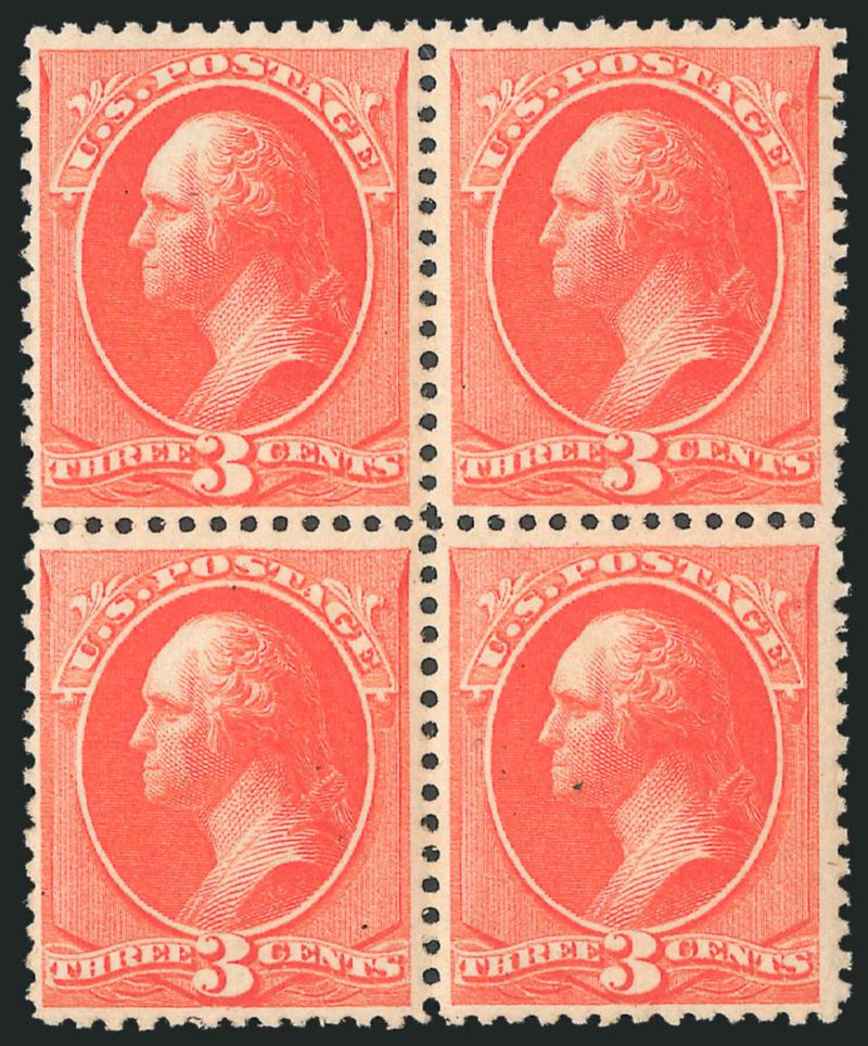 1438 nhbl Image3c Vermilion (214). Mint N.H. block of four, vivid color, well-centered, small natural inclusion top left stamp, Very Fine, Scott Retail as singles (Image)