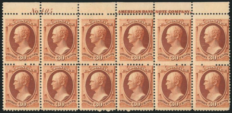 1444 ogbl Image30c Orange Brown (217). Top imprint and plate no. 405 block of twelve, original gum, most stamps lightly hinged, radiant color, few minor perf separations, natural gum crease affects seven stamps (but not plate no. pair), rounded corner at bottom right, pos. 3 thin spot, still appears Fine, a scarce full plate block of twelve, Scott Catalogue lists but does not price the plate block of twelve, Scott Retail as plate block of ten and two singles (Image)