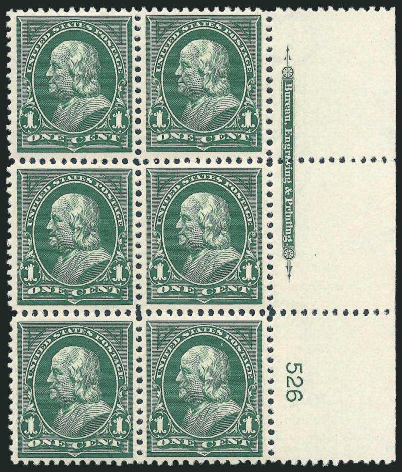 1620 nhbl Image1c Deep Green (279). Mint N.H. right imprint and plate no. 526 block of six, gorgeous color on post-office fresh paper, beautiful centering, Extremely Fine (Image)