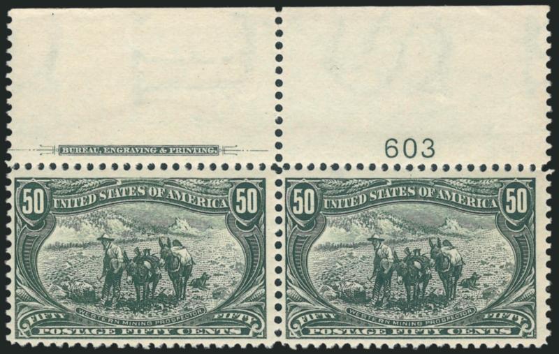 VERY FINE. A BEAUTIFUL MINT NEVER-HINGED IMPRINT AND PLATE NUMBER PAIR OF THE 50-CENT TRANS-MISSISSIPPI ISSUE.