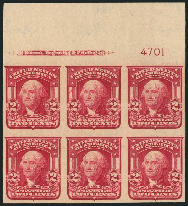 1747 nhbl Image2c Lake, Ty. II, Imperforate (320a). Mint N.H. top imprint and plate no. 4701 block of six, large margins, deep rich color in this distinctive shade, fresh and Very Fine, this is the only Mint N.H. top plate block we located using Power Search (Image)