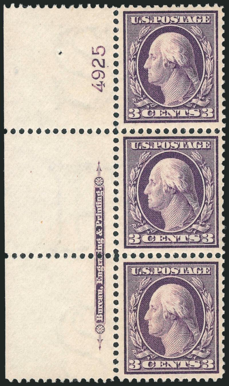3c Deep Violet (333). Mint N.H. vertical strip of three with left imprint and plate no. 4925, fresh and bright, exceptional centering, Very Fine-Extremely Fine, with 2011 P.S.E. certificate (Image)Search for comparables at SiegelAuctions.com |