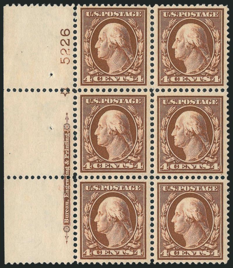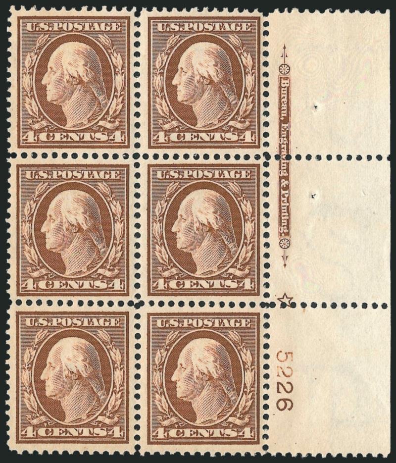 4c Orange Brown (334). Mint N.H. right imprint, plate no. 5226 and star block of six with wide selvage, rich color, bottom right stamp small natural gum skip, Fine-Very Fine, a pretty plate