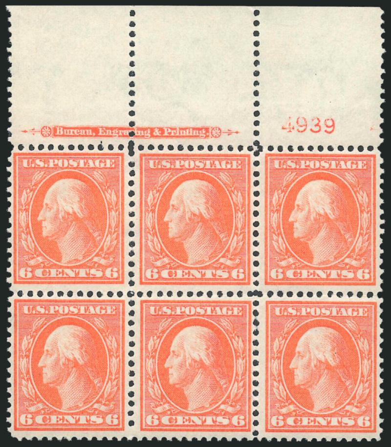 6c Red Orange (336). Mint N.H. top imprint and plate no. 4939 block of six, vivid color on crisp paper, ample to wide margins throughout, single unpunched perf at bottom between pos. 4 and 5,