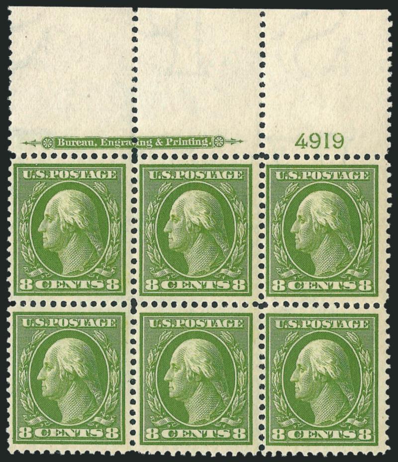 8c Olive Green (337). Top imprint and plate no. 4919 block of six, five stamps Mint N.H., top center stamp lightly hinged, rich color, Fine-Very Fine
