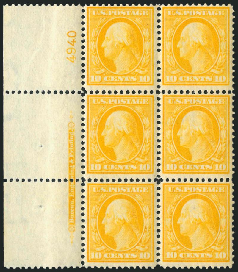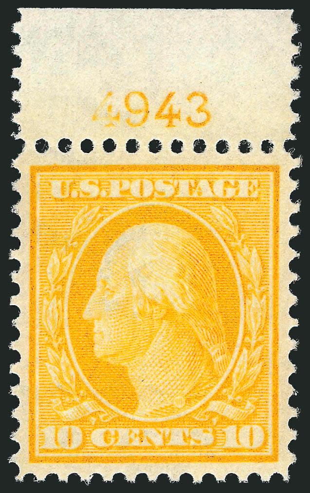 10c Yellow (338). Mint N.H. with top plate no. 4943, striking golden color, Extremely Fine, with 2011 P.S.E. certificate (XF 90, SMQ $325.00) (Image)Search for comparables at SiegelAuctions.com |