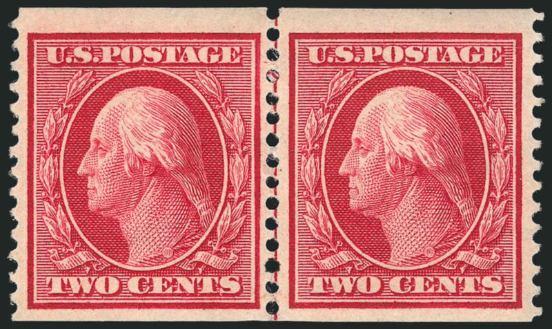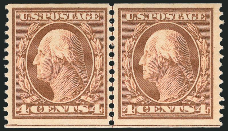 VERY FINE AND CHOICE. A DESIRABLE AND RARE MINT NEVER-HINGED GUIDE LINE PAIR OF THE 1909 4-CENT HORIZONTAL COIL, SCOTT 354.