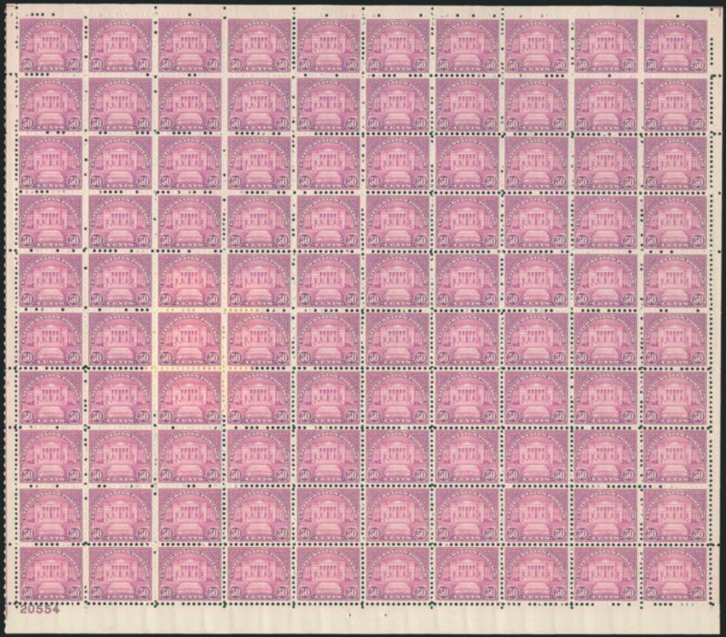 874 nhbl Image50c Lilac (701). Mint N.H. pane of 100 with plate no. 20554 at lower left, vibrant color on bright paper, far better centering and overall condition than normally seen