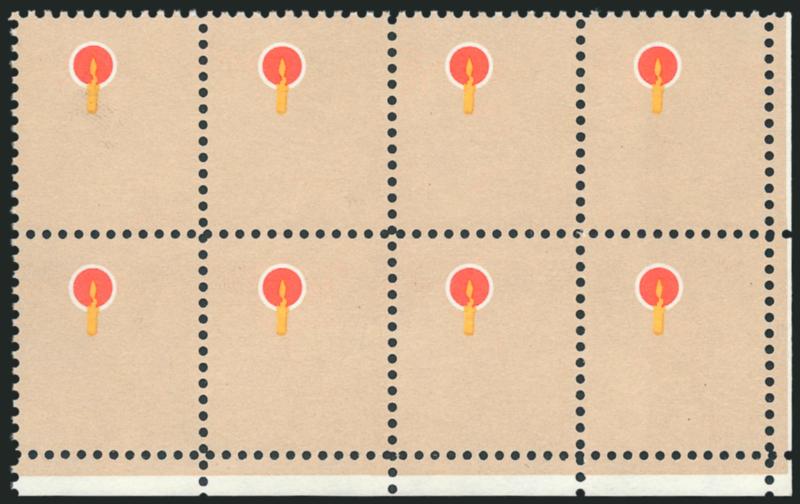 877 nhbl Image$1.00 Rush Lamp, Engraved Brown Omitted (1610a). Mint N.H. bottom right corner block of eight, Very Fine and choice, this is the corner position on the sheet which yields the Zip positions which is also omitted, accompanied by normal multiple of the same size for comparison, Scott Retail as singles (Image)