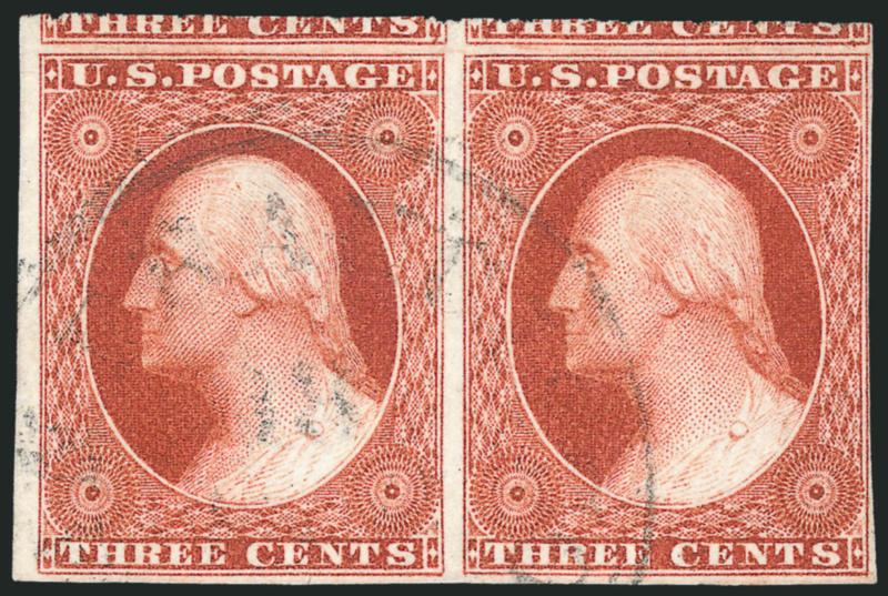 177   Image3c Orange Brown, Ty. II (10A). Positions 51-52R0, horizontal pair, brilliant color, huge margins to just clear at right including left sheet margin and large portions of adjoining stamps at top, light town cancel, tiny insignificant corner crease at bottom right, Very Fine and choice pair, the left stamp Extremely Fine (Image)