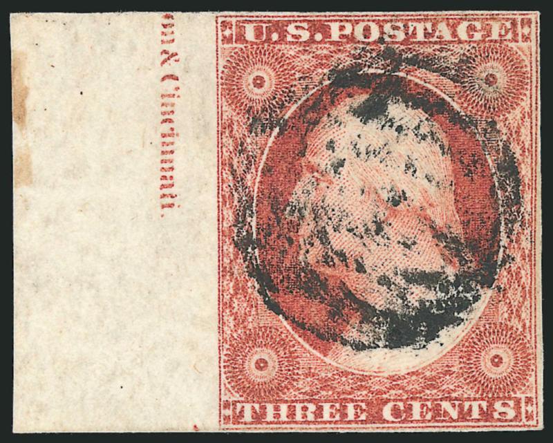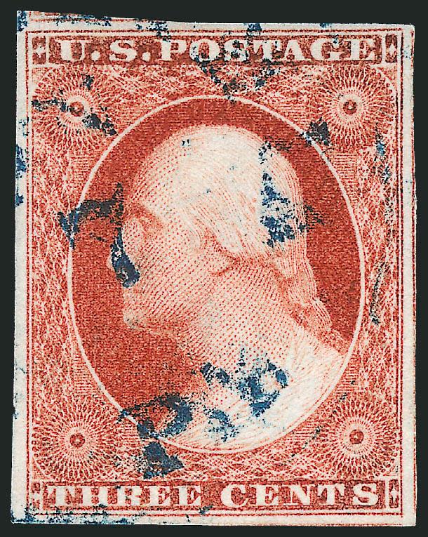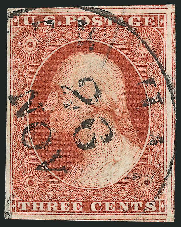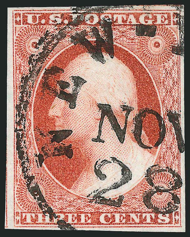 223   Image3c Experimental Orange Brown, Ty. II (11A var). Position 86L1L, full to large margins including traces of adjoining stamps at top and left, vivid color, bold strike of New York Nov. 28 circular datestamp, Extremely Fine, ex Beals, mounted to Dr. Amonette's signed plating card for display (Image)