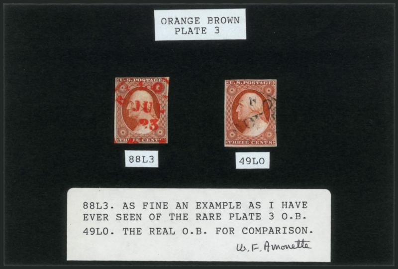 225   Image3c Experimental Orange Brown, Ty. II (11A var). Position 88L3, large margins to barely in, rich color nicely complemented by red circular datestamp cancel, Very Fine, accompanied by No. 10A Position 49L0 for comparison and on card signed by Dr. Amonette, most Experimental Orange Browns come from Plate 1 Late and this example from Plate 3 is very rare (Image)