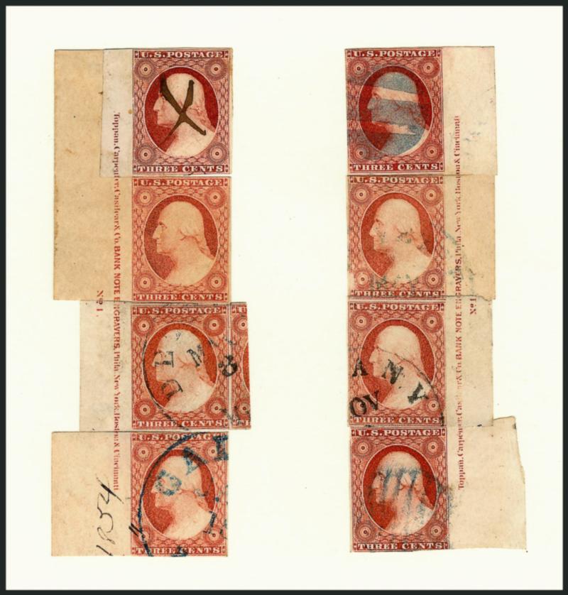 3c Red (Shades), Ty. I, II, Imprint and Plate No. Reconstruction (11-11A). Complete imprint and plate no. reconstruction for each of the imperforate plates used to print the 3c 1851 Dull Red Issue