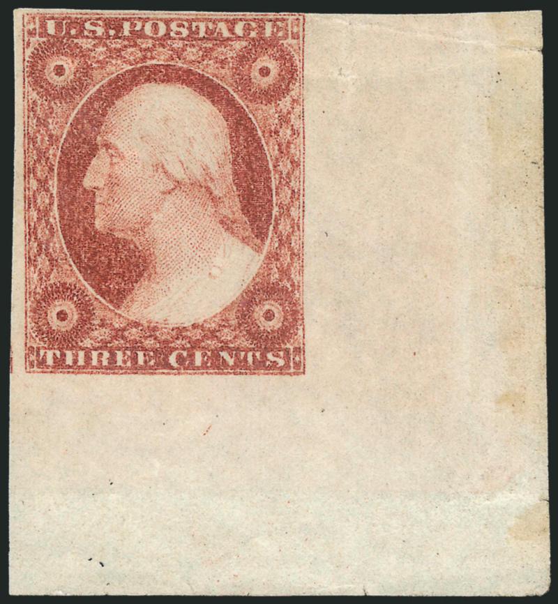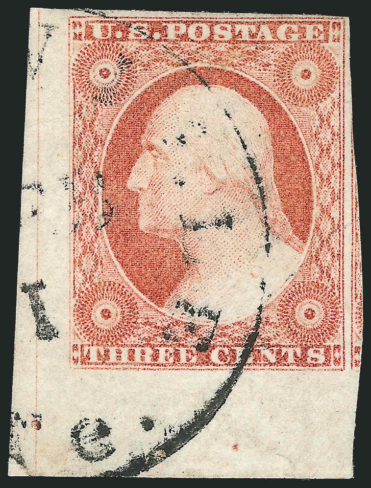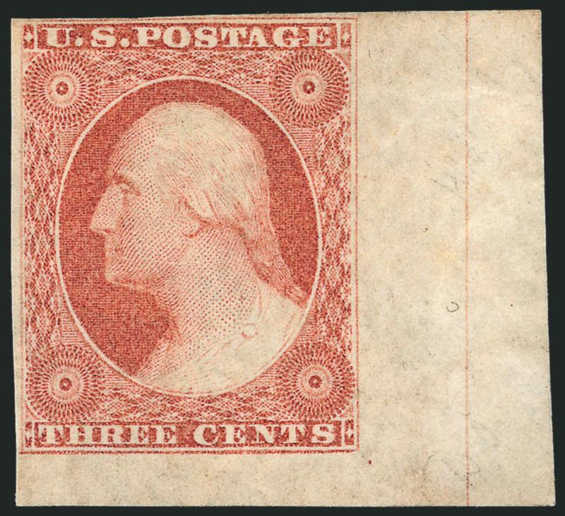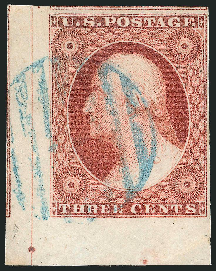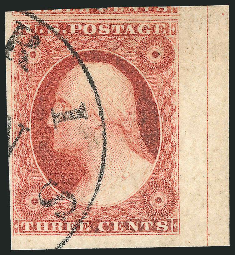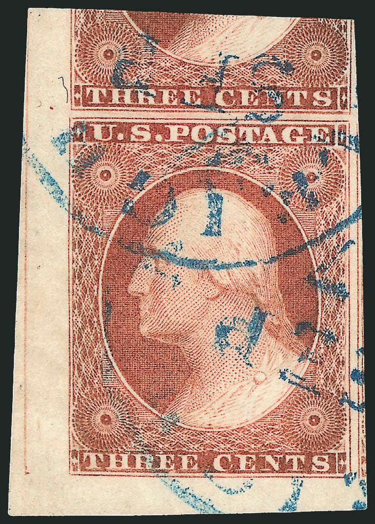 308   Image3c Dull Red, Ty. I (11). Huge margins all around including bottom left corner interpane margins with centerline and part of adjoining stamps on other two sides (significant portion at top), radiant color nicely complemented by blue circular datestamps, Extremely Fine Gem, a phenomenal stamp in every respect (Image)