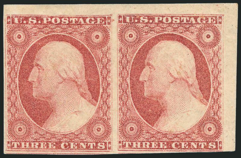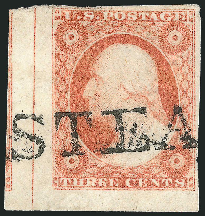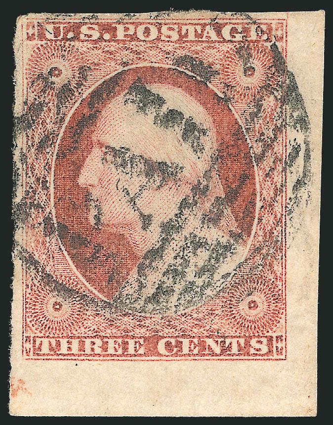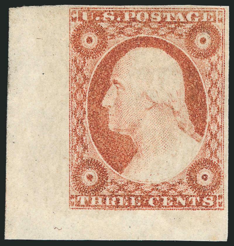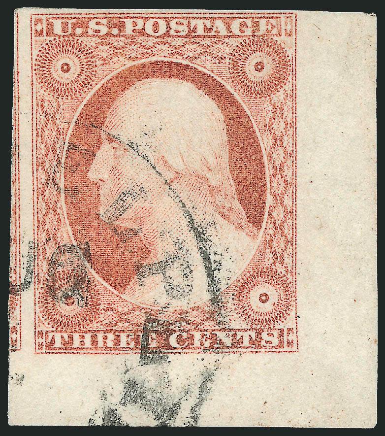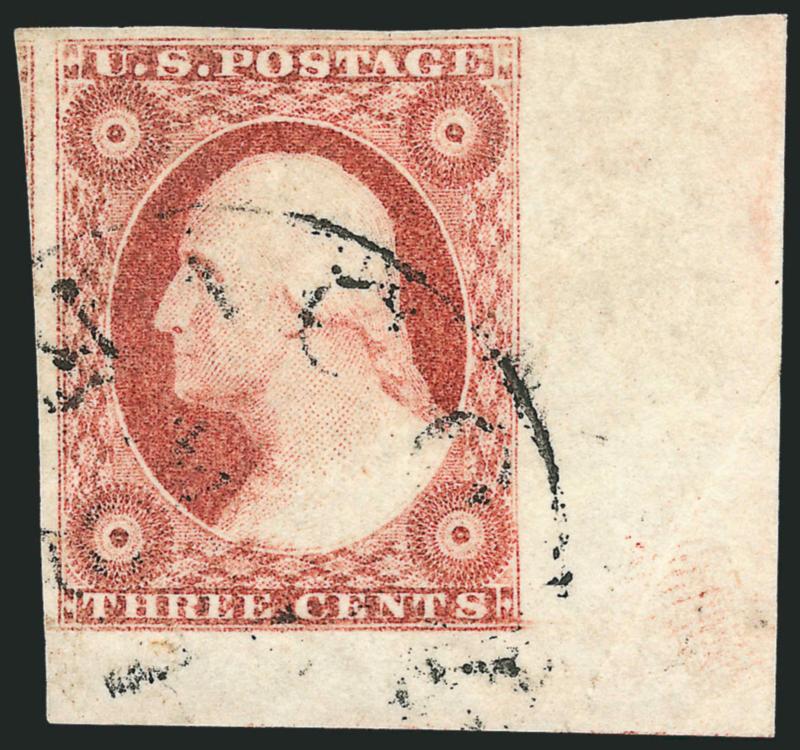 308   Image3c Dull Red, Ty. I (11). Huge margins all around including bottom left corner interpane margins with centerline and part of adjoining stamps on other two sides (significant portion at top), radiant color nicely complemented by blue circular datestamps, Extremely Fine Gem, a phenomenal stamp in every respect (Image)