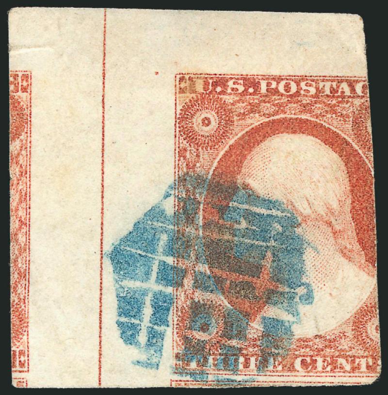 340   Image3c Dull Red, Ty. II (11A). Position 1R3, massive top left corner straddle-pane margins with large portion of Pos. 10L3, which is fully 12mm from the left of 1R3, this results in the stamp being cut in at the right, neat blue grid cancel, small tear and crease, a striking and very rare straddle-pane stamp from Plate 3, the distance between the panes makes this a most remarkable occurrence (Image)