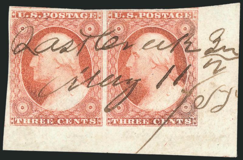 358   Image3c Dull Red, Ty. II (11A). Positions 99-100R2L, horizontal pair, huge margins to full including bottom right corner sheet margins, brilliant color, neat manuscript town cancel from May 11, 1855, small corner crease at top right in margin only, Very Fine-Extremely Fine, scarce with a manuscript town cancel (Image)
