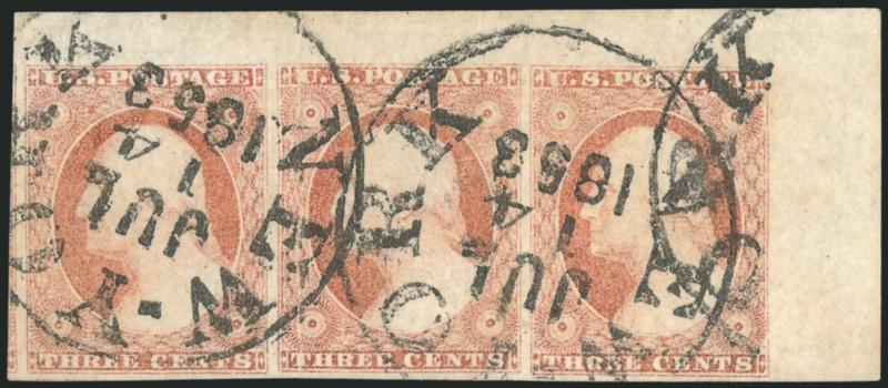 359   Image3c Dull Red, Ty. I (11). Positions 8-10R3, horizontal strip of three, huge margins including top right corner sheet margins and part of adjoining stamp at left, bright color, bold strikes of "New York Jul. 14, 1853" circular datestamp, center stamp with vertical crease, Extremely Fine appearance and a wonderful example of the July 1853 New York year-dated cancel, we wonder how much longer this beautiful multiple will stay intact, from our 1995 Rarities of the World sale (Image)