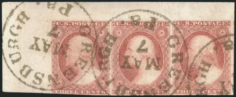 360   Image3c Dull Red, Ty. I (11). Horizontal strip of three, huge margins to just in at lower left including top left corner sheet margins and part of adjoining stamp at right, radiant color, neat strikes of "Greensburgh Pa. May 7" circular datestamp, each stamp with small thin spot, Fine-Very Fine appearance (Image)
