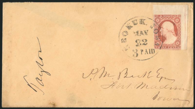 362 c Image3c Dull Red, Ty. II (11A). Large to huge margins including top right corner interpane margins with centerline and part of adjoining stamp at bottom, radiant color, tied by clear strike of "Keokuk, Iowa Paid 3 May 22" circular datestamp on cover to Fort Madison Iowa, Extremely Fine, a gorgeous corner-margin copy on cover (Image)