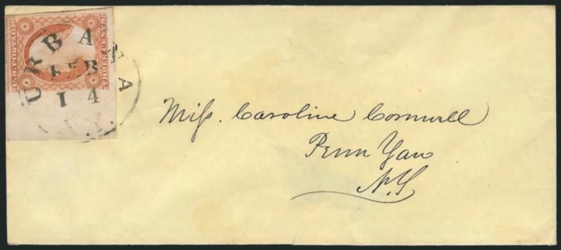 363 c Image3c Dull Red, Ty. I (11). Position 91L4, huge margins to full including bottom left corner sheet margins, bright color, tied by "Urbana N.Y. Feb. 14" circular datestamp on yellow cover to Penn Yan N.Y., missing small part of bottom flap, tiny cover tear at bottom, Extremely Fine, a beautiful cover (Image)