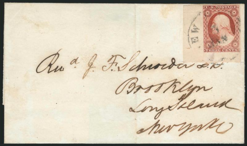 364 c Image3c Dull Red, Ty. II (11A). Huge bottom left corner sheet margins, full and even other two sides, tied by New York circular datestamp on folded cover to Brooklyn, 1853 docketing on back, stamp with light vertical crease near top, central file fold, Extremely Fine appearance (Image)