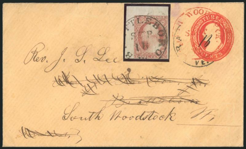 365 c Image3c Dull Red, Ty. II (11A). Position 1L1L with large top left corner sheet margins, tied by "Brattleboro Vt. Sep. 16" circular datestamp on forwarded 3c Red Nesbitt entire with red "Nesbitt N.Y." seal on back, cover originated in South Woodstock with red "South Woodstock Vt. Sept. 16" circular datestamp, date in ms., sent to Brattleboro where 3c adhesive was affixed and forwarded back to South Woodstock, stamp removed to reveal markings and mounted at top of cover, Very Fine, a beautiful stamp and nice usage (Image)
