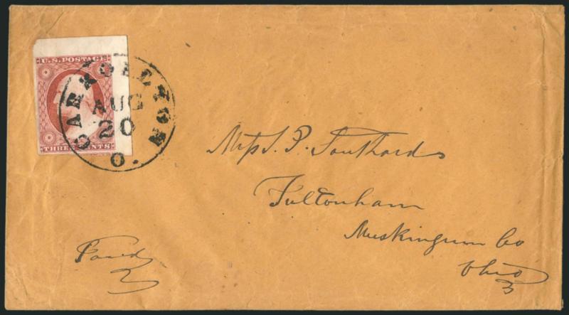 366 c Image3c Dull Red, Ty. II (11A). Large top right corner sheet margins, tied by "Carrollton O. Aug. 20" circular datestamp on cover to Fultonham O., some cover wrinkling causes a small diagonal crease in stamp, otherwise Very Fine (Image)
