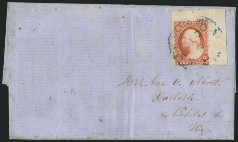 367 c Image3c Dull Red, Ty. I (11). Huge top right corner sheet margins, rich color, stamp separated a bit roughly at left and bottom but margins clear, tied by indistinct strike of "Columbia Tenn. Aug. 3" circular datestamp on 1855 blue folded letter to Carlisle Ky., some light wear and toned spots, otherwise Very Fine (Image)