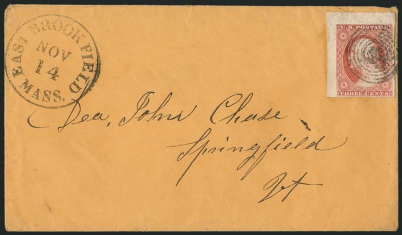 368 c Image3c Dull Red, Ty. II (11A). Large to huge margins including top left corner sheet margins, tied by unusual target cancel, "East Brookfield Mass. Nov. 14" circular datestamp on orange cover to Springfield Vt., Extremely Fine Gem, a superb stamp and cover (Image)