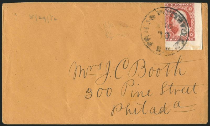 369 c Image3c Dull Red, Ty. II (11A). Large bottom right corner sheet margins, bright color, tied by "Phila. & Pottsville R.R. Aug. 30" route agent's circular datestamp on brown cover to Philadelphia street address, stamp with some gum staining in bottom margin, otherwise Very Fine (Image)