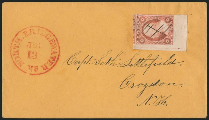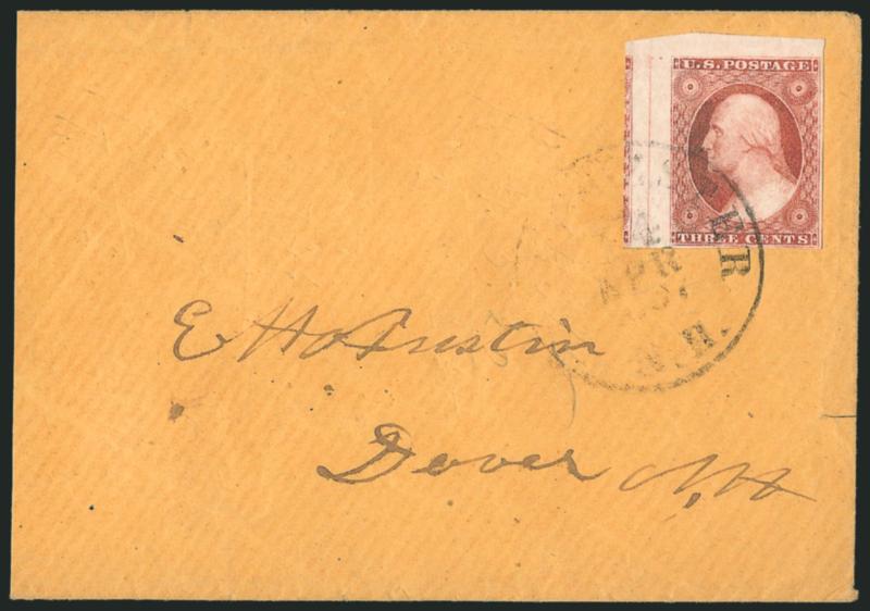 370 c Image3c Dull Red, Ty. II (11A). Huge bottom left corner interpane margins with centerline, large margins other two sides with portions of adjoining stamps, pen cancelled, red "North Bridgewater Ms. Jul. 13" circular datestamp on yellow cover to Croydon N.H., light diagonal bend at left of stamp, otherwise Extremely Fine, striking (Image)