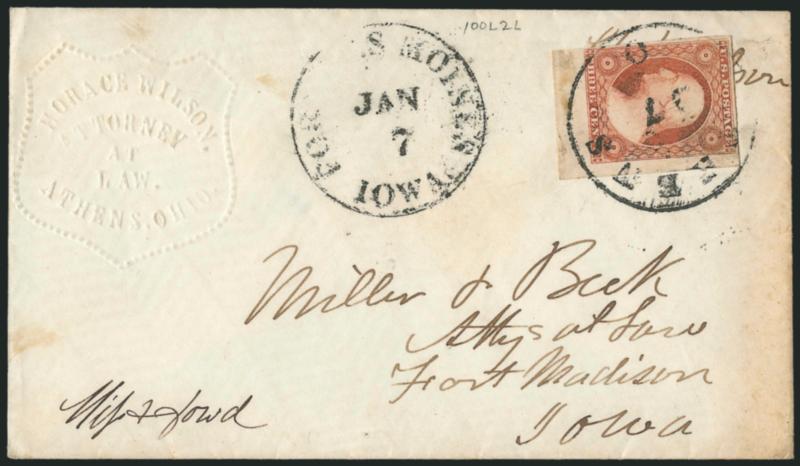 371 c Image3c Dull Red, Ty. II (11A). Position 100L2L, large bottom right corner sheet margins, tied by "Athens O. ? 27" circular datestamp on attorney embossed corner card cover to Fort Madison Iowa, missent to Fort Des Moines, ms. "Miss & fowd" with "Fort Des Moines Iowa Jan. 7" circular datestamp, attorney's name signed under stamp which has some gum soaks confined mostly to margin, Very Fine and interesting use (Image)