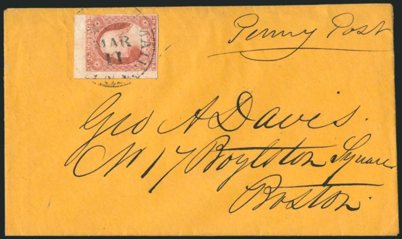 372 c Image3c Dull Red, Ty. II (11A). Large top left corner sheet margins, full at bottom, slightly rough at upper right, tied by light strike of "U.S. Express Mail N.Y. N. York Mar. 11" circular datestamp on yellow 1854 cover to street address in Boston, back with blue seal of Superintendent Office of the Central Railroad N.J., endorsed "Penny Post" at top right for local delivery in Boston, original letter datelined "March 11th, 1854, Elizabeth Port", backflap tear thru seal, otherwise Very Fine, a beautiful cover (Image)
