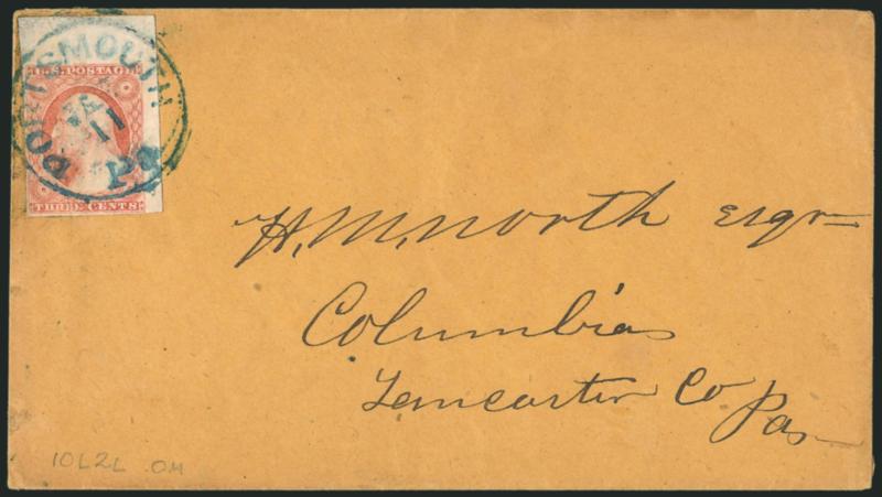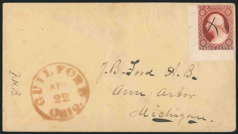 376 c Image3c Dull Red, Ty. II (11A). Position 91L3, large to huge margins including bottom left corner sheet margins, intense shade on bright paper, cancelled by neat manuscript "X", red "Guilford Ohio Apr. 22" circular datestamp on cover to Ann Arbor Mich., missing part of top flap, Extremely Fine, a beautiful stamp and cover (Image)