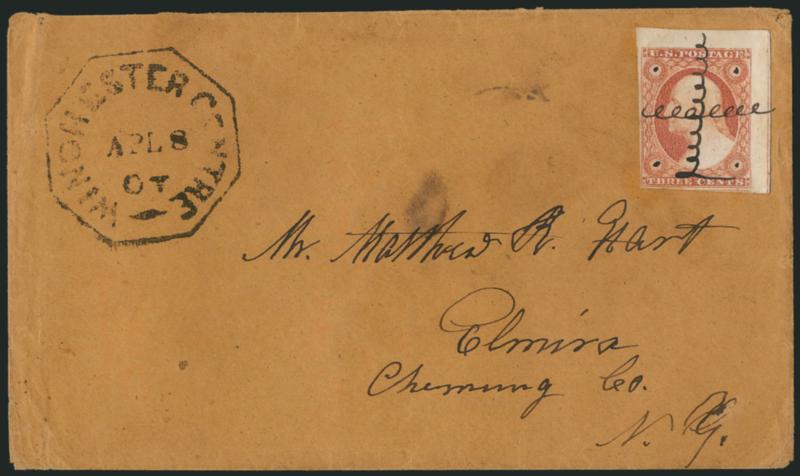 375 c Image3c Dull Red, Ty. II (11A). Huge margins to just in including top right corner sheet margins, tied by unusual manuscript squiggles, "Winchester Centre Ct. Apl. 8" octagonal datestamp on cover to Elmira N.Y., stamp with small flaws at lower right in margin only, cover with some soiling, still Very Fine and scarce (Image)