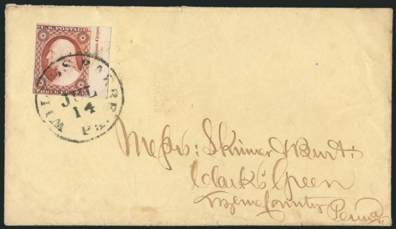 430 c Image3c Claret, Ty. II (11A). Position 70R2L, huge margins to full including right sheet margin with part imprint, rich color, tied by "Wilkes-Barre Pa. Jul. 14" circular datestamp on cover to Clark's Green Pa., few minor cover edge tears, Extremely Fine (Image)