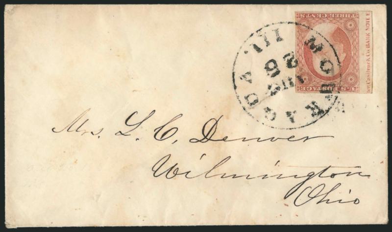 431 c Image3c Claret, Ty. II (11A). Position 41L2L, huge margins to clear including left sheet margin with part imprint, radiant color, tied by Aug. 25 Ill. circular datestamp on cover to Wilmington O., cover with small internal tear, Very Fine (Image)