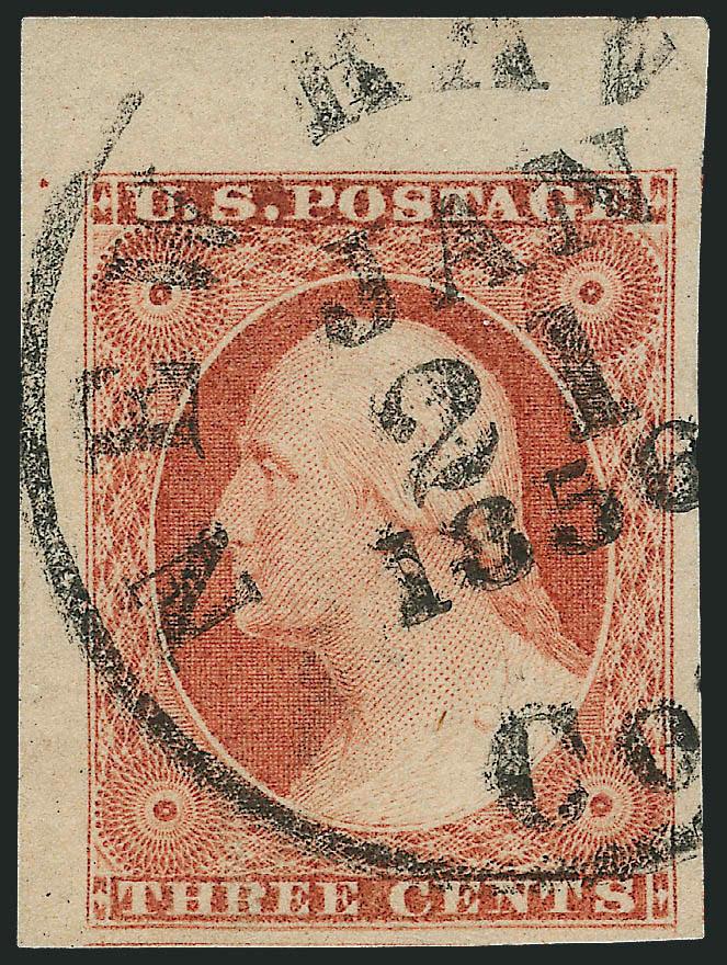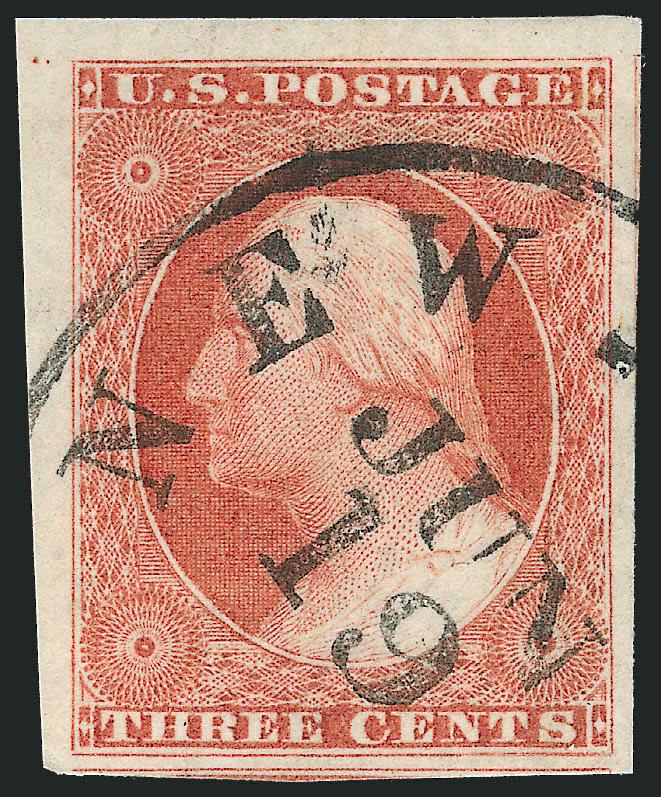 432   Image3c Claret, Ty. II (11A). Large to huge margins including top left corner sheet margins, bright shade, neat strike of 1856 New Haven Ct. circular datestamp, Extremely Fine Gem (Image)