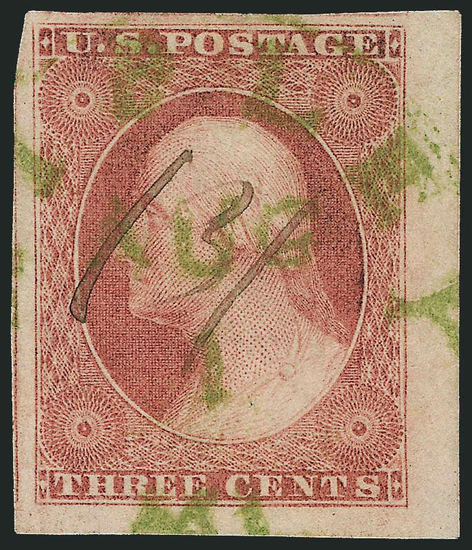 434   Image3c Claret, Ty. II (11A var). Large to huge margins all around including bottom right corner sheet margins, brilliant color, neat manuscript cancel and bright green Ripley Miss. circular datestamp, Extremely Fine, a stamp with tremendous eye appeal (Image)