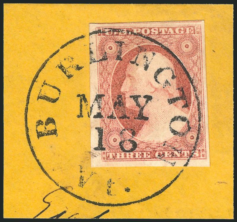 437   Image3c Pale Claret, Ty. II (11A). Large margins all around including bottom left corner sheet margins and portion of adjoining stamp at top, pretty shade, tied by "Burlington Vt. May 18" circular datestamp on small yellow piece, Extremely Fine Gem (Image)