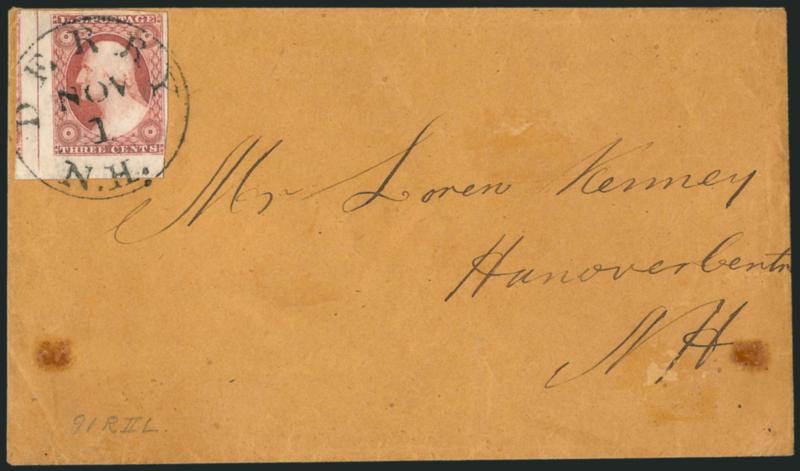 441 c Image3c Claret, Ty. II (11A). Position 91R2L, huge bottom left corner straddle-pane margins, portion of Pos. 100L2L at left, just touched at bottom right, tied by clear strike of "Derry N.H. Nov. 1" circular datestamp on buff cover to Hanover Center N.H., couple small stained spots on front and back do not affect the stamp, nice on-cover usage of a Very Fine and choice stamp (Image)