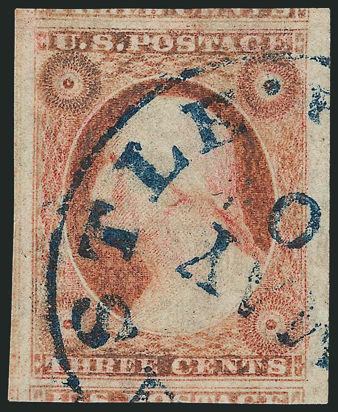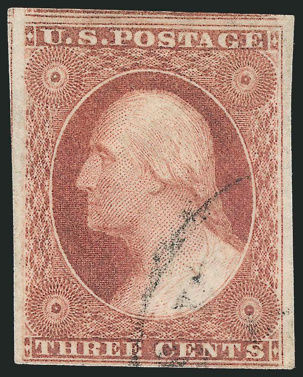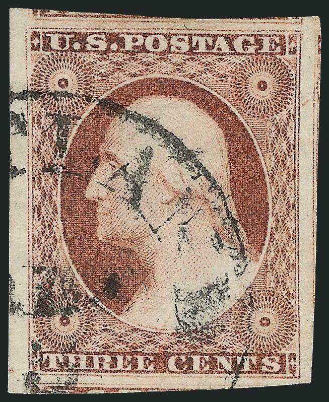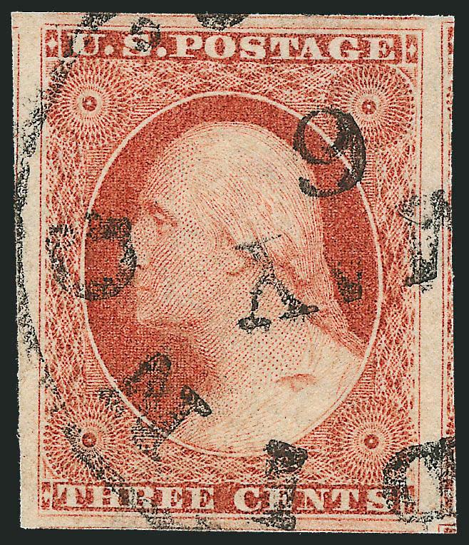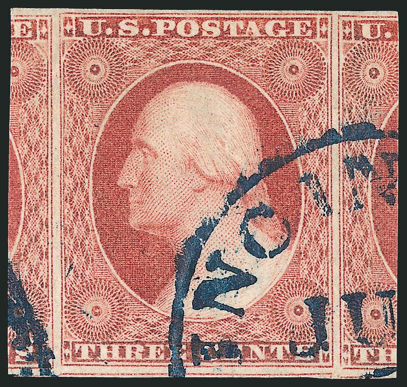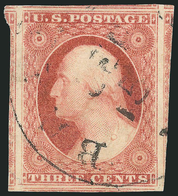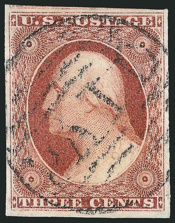 467   Image3c Claret, Ty. I (11). Enormous margins including parts of seven adjoining stamps, deep rich color, unobtrusive and virtually face-free strike of town cancel, Extremely Fine Gem, a superb stamp in every respect (Image)
